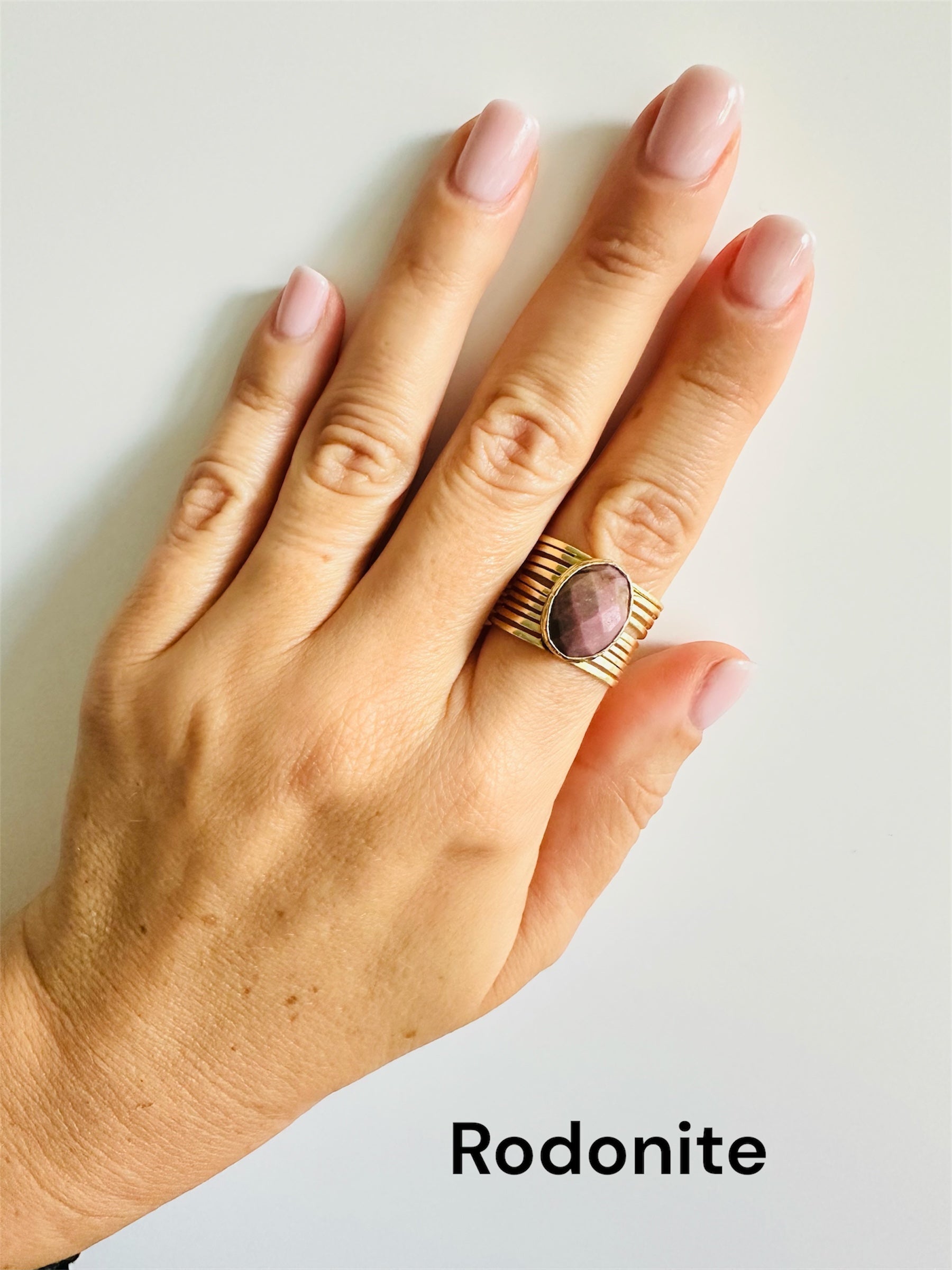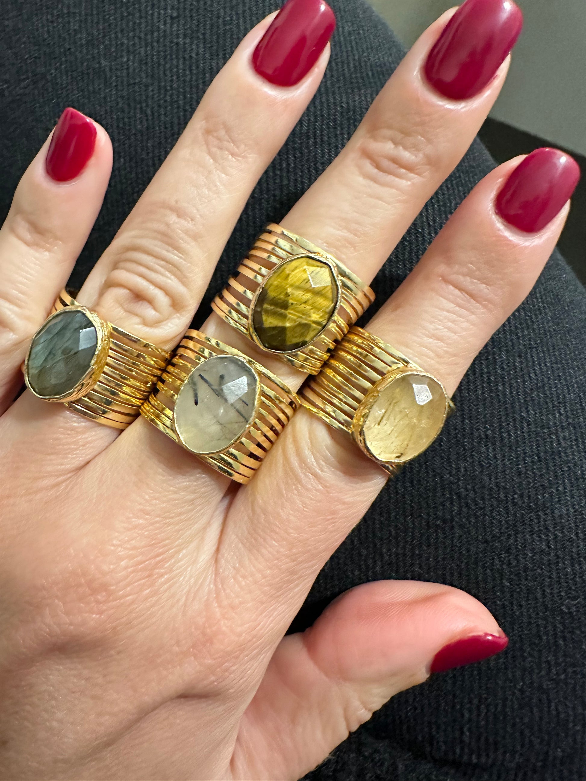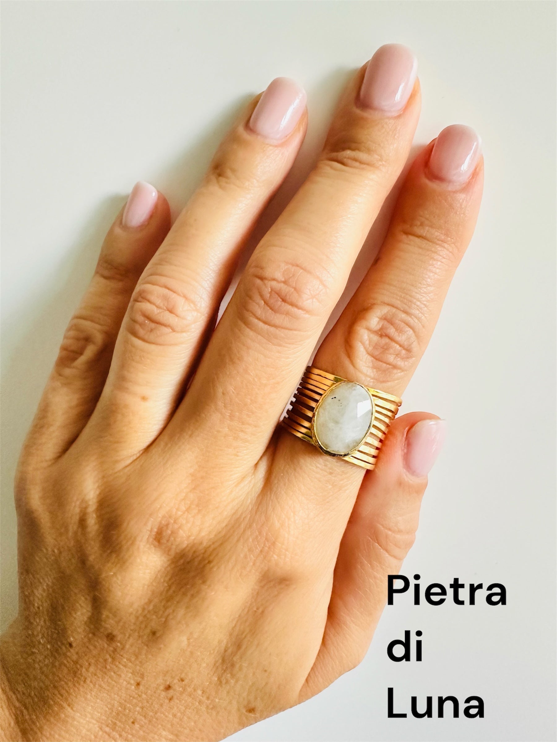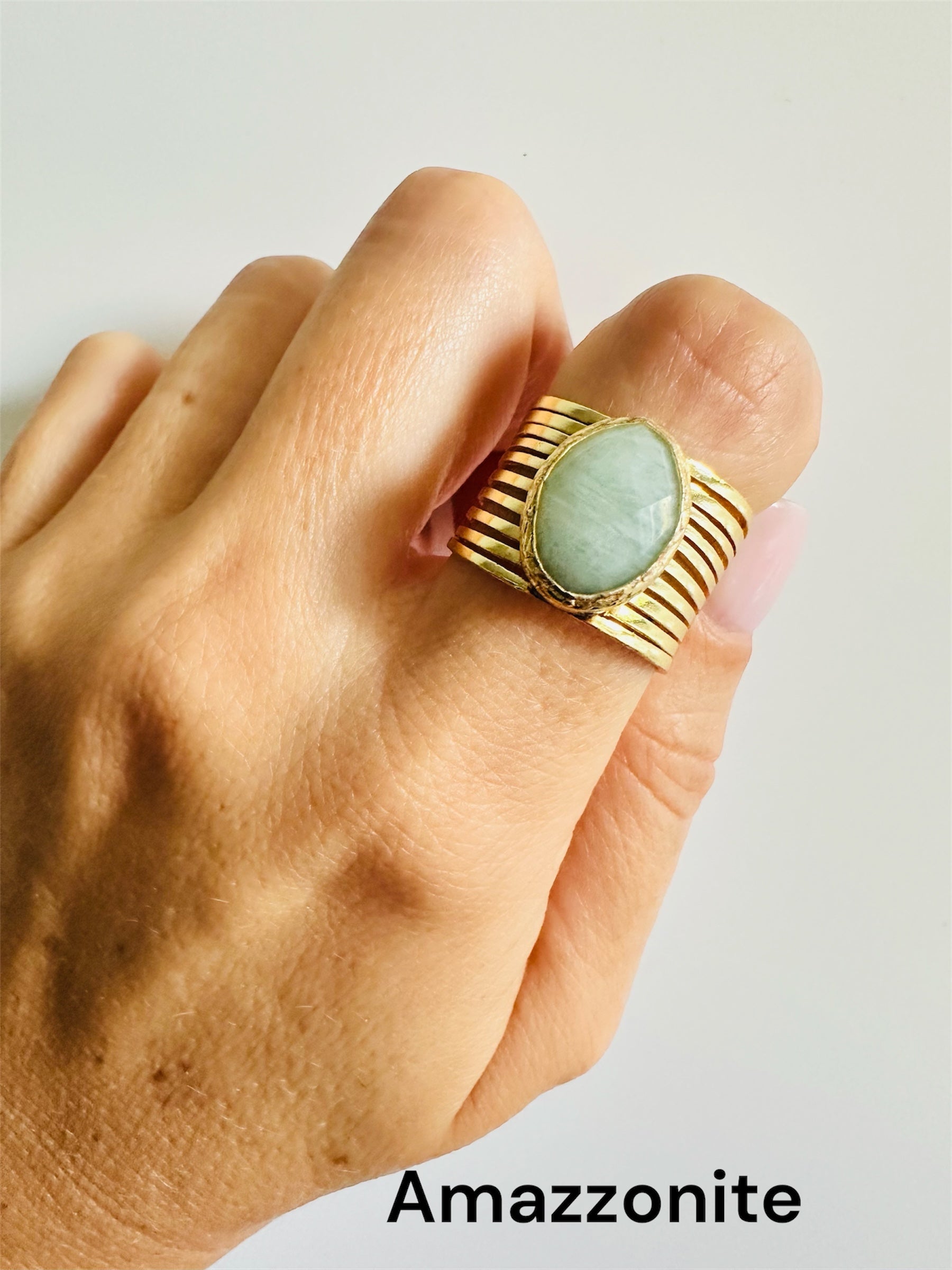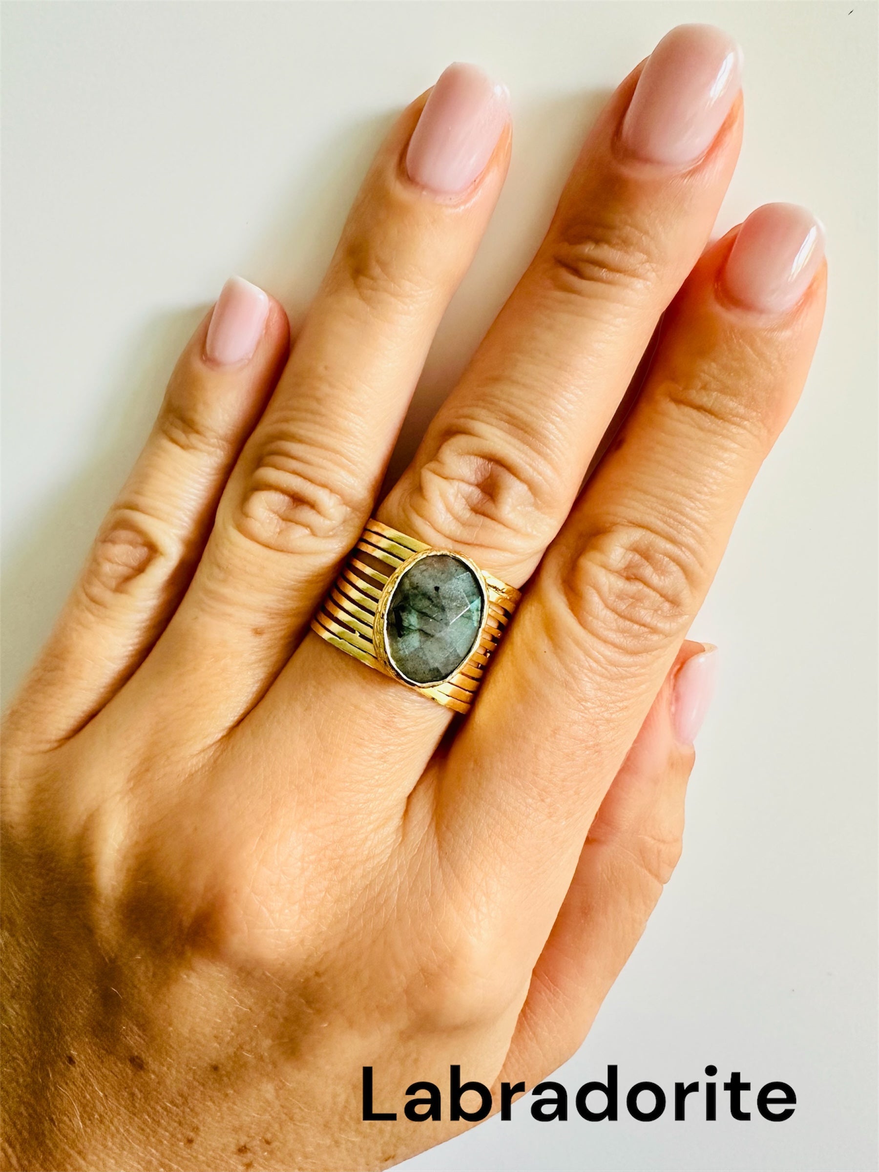 Bellissimo anello a fascia in ottone placcato oro con pietra naturale. Disponibile attualmente con labradorite, amazzonite e pietra di luna.