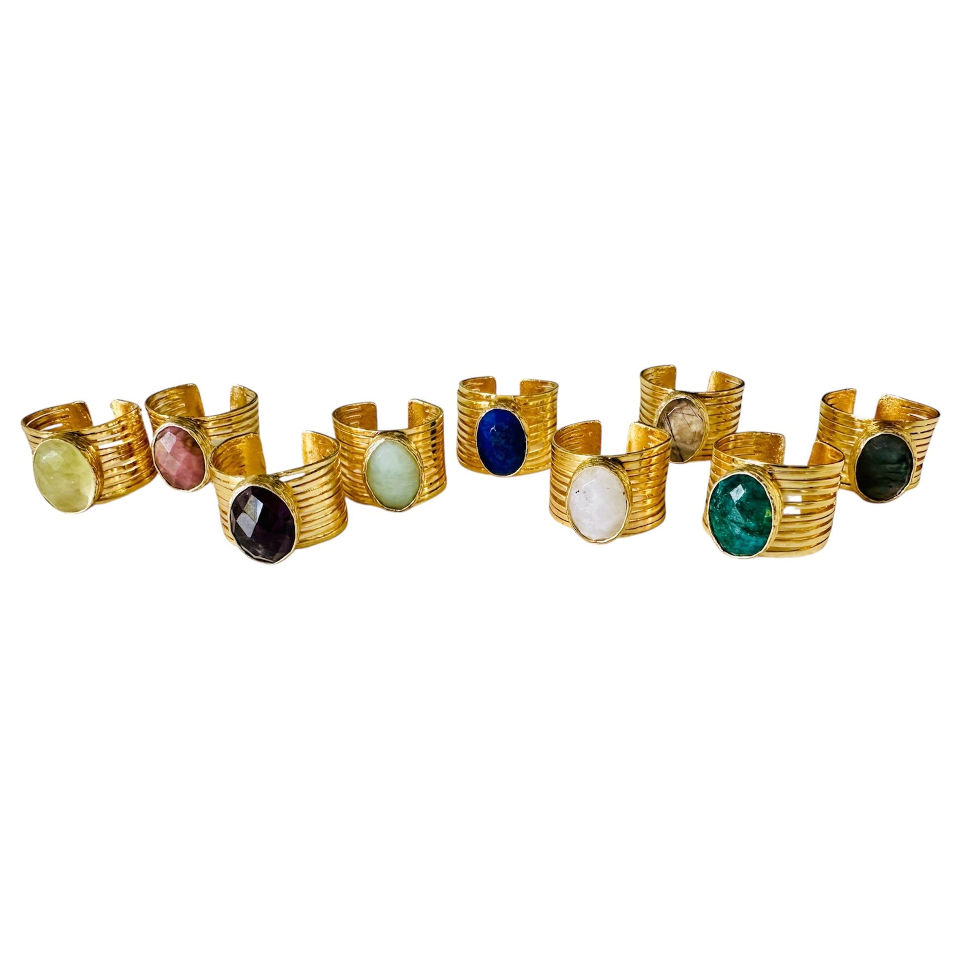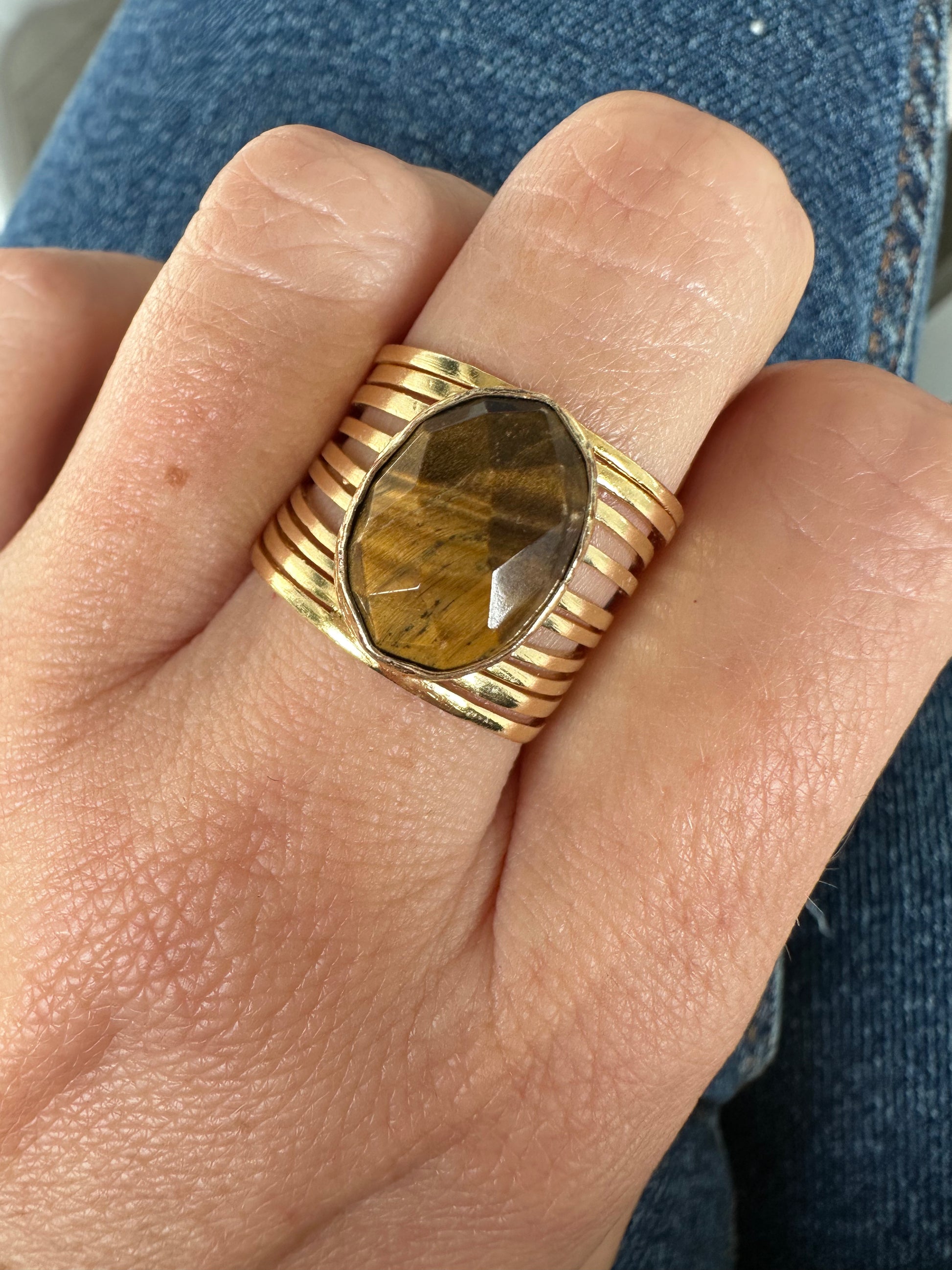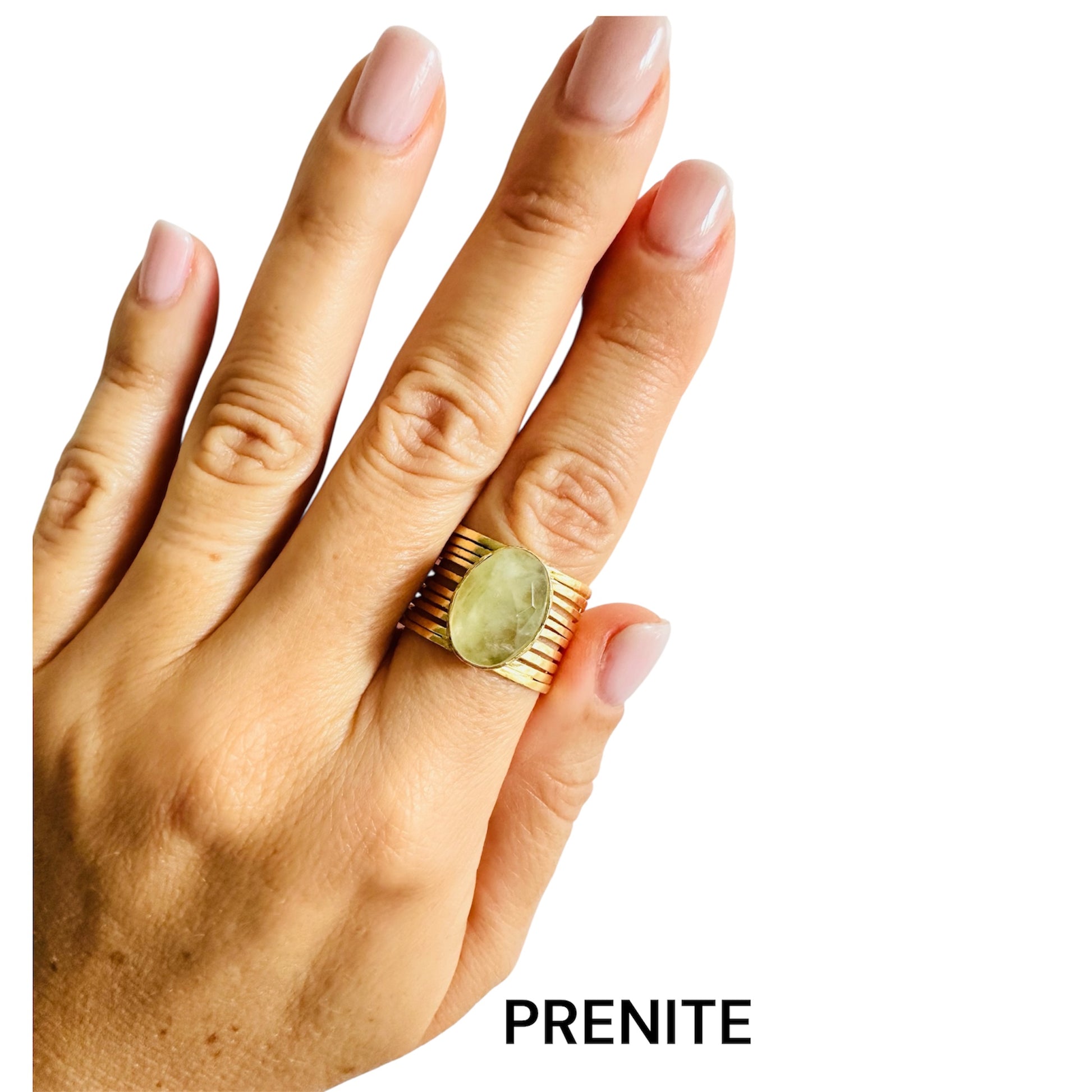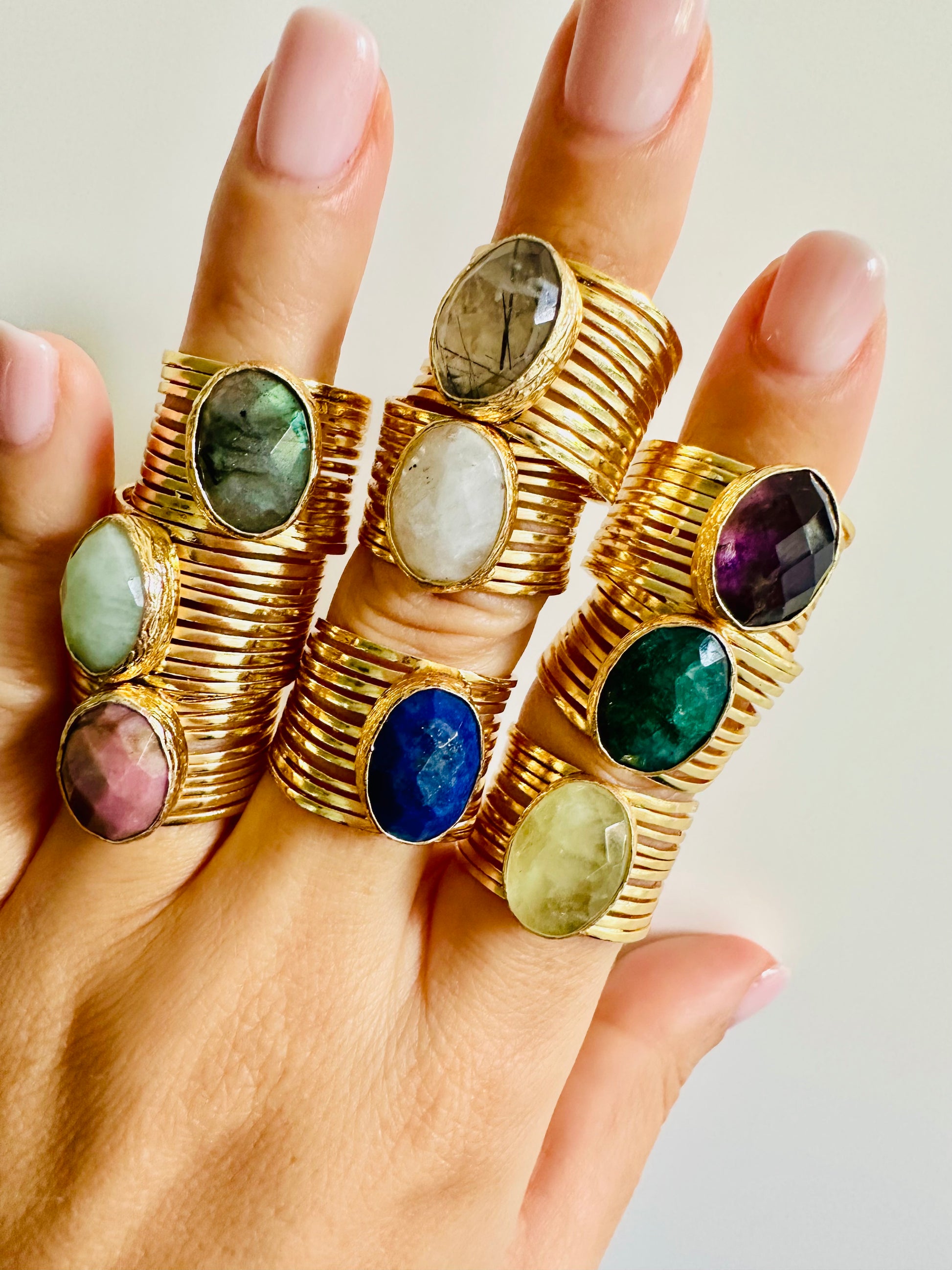 Bellissimo anello a fascia in ottone placcato oro con pietra naturale. Disponibile attualmente con labradorite, amazzonite e pietra di luna.