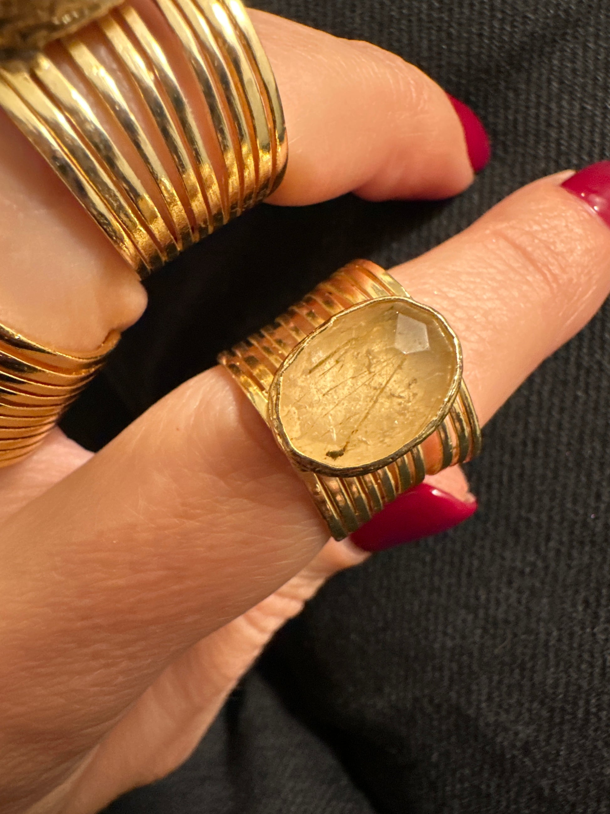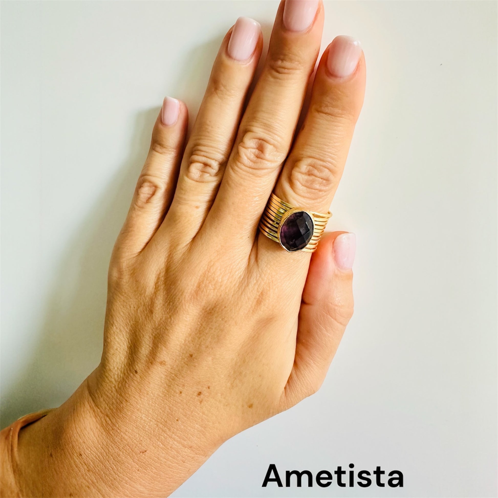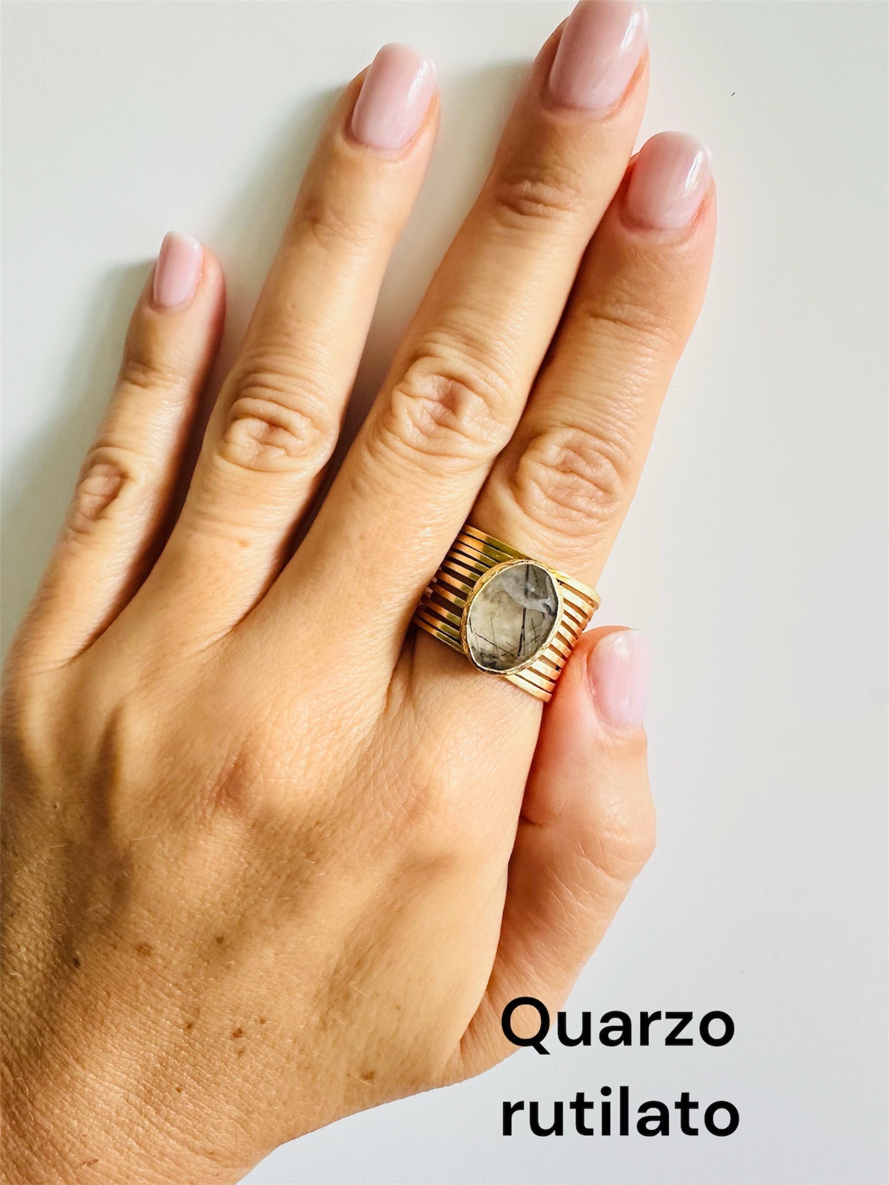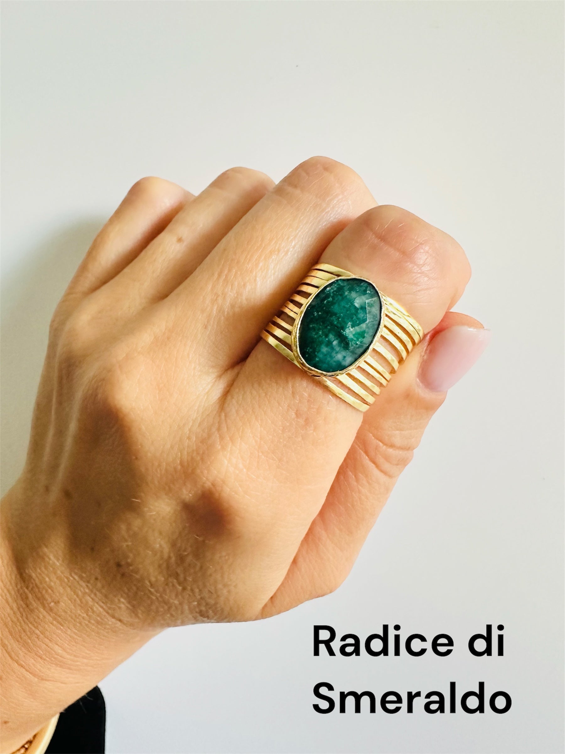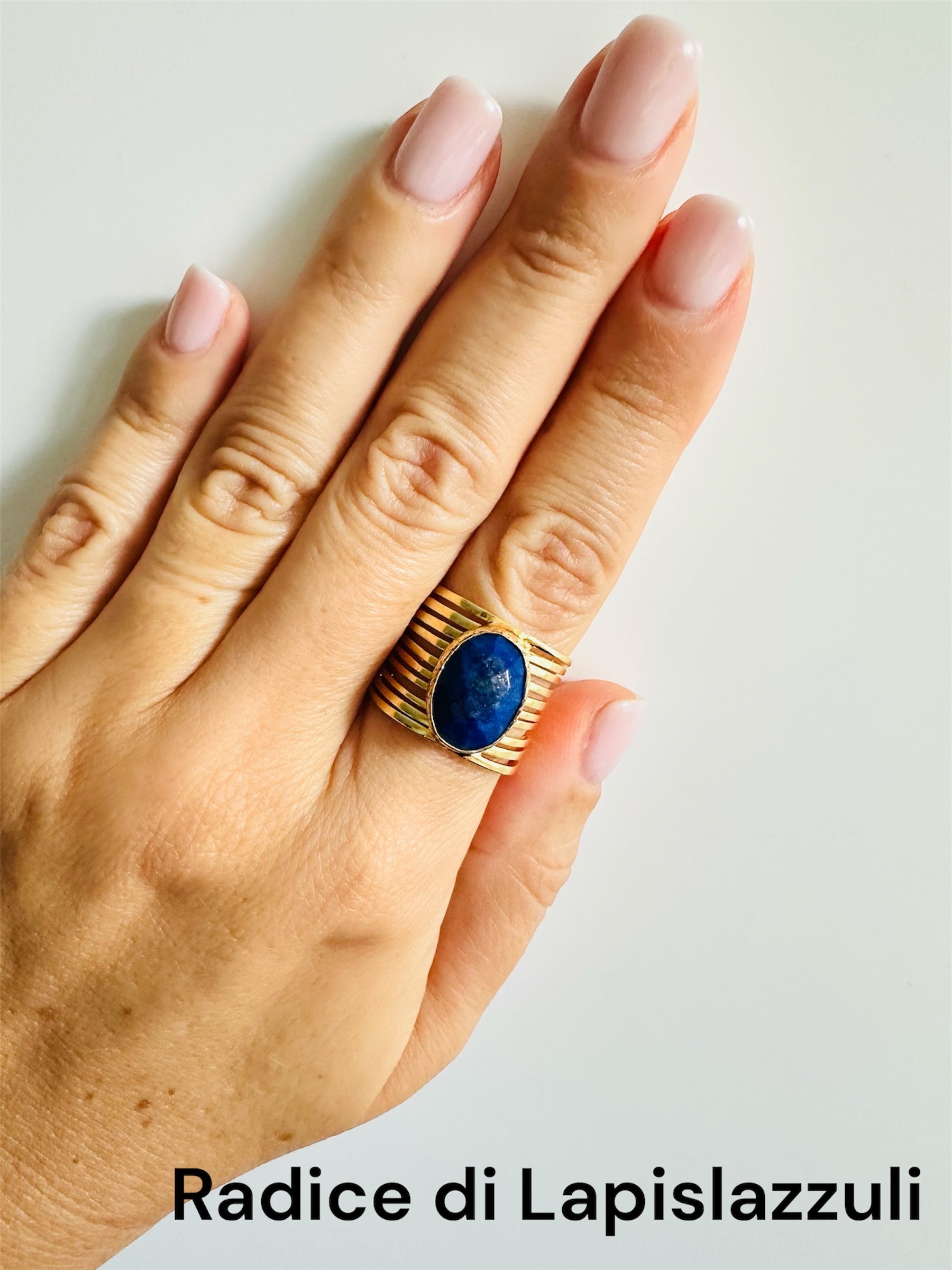Bellissimo anello a fascia in ottone placcato oro con pietra naturale. Disponibile attualmente con labradorite, amazzonite e pietra di luna.