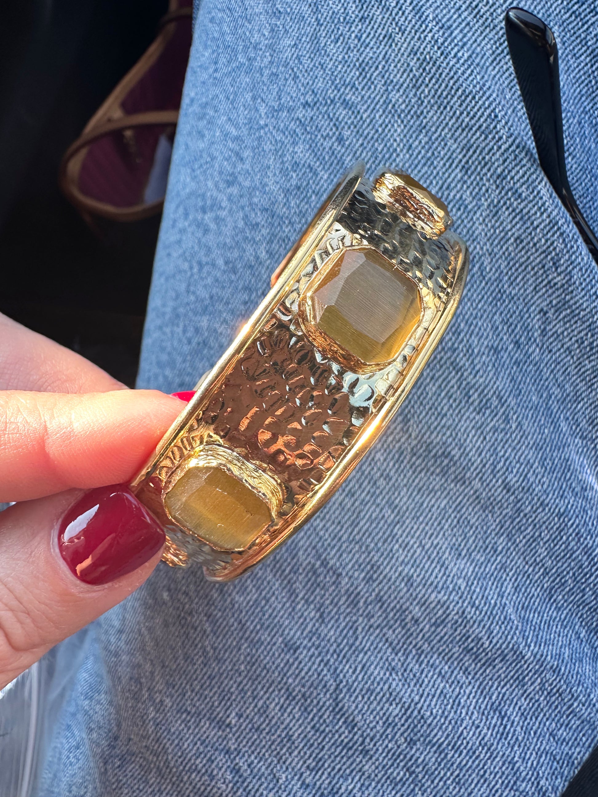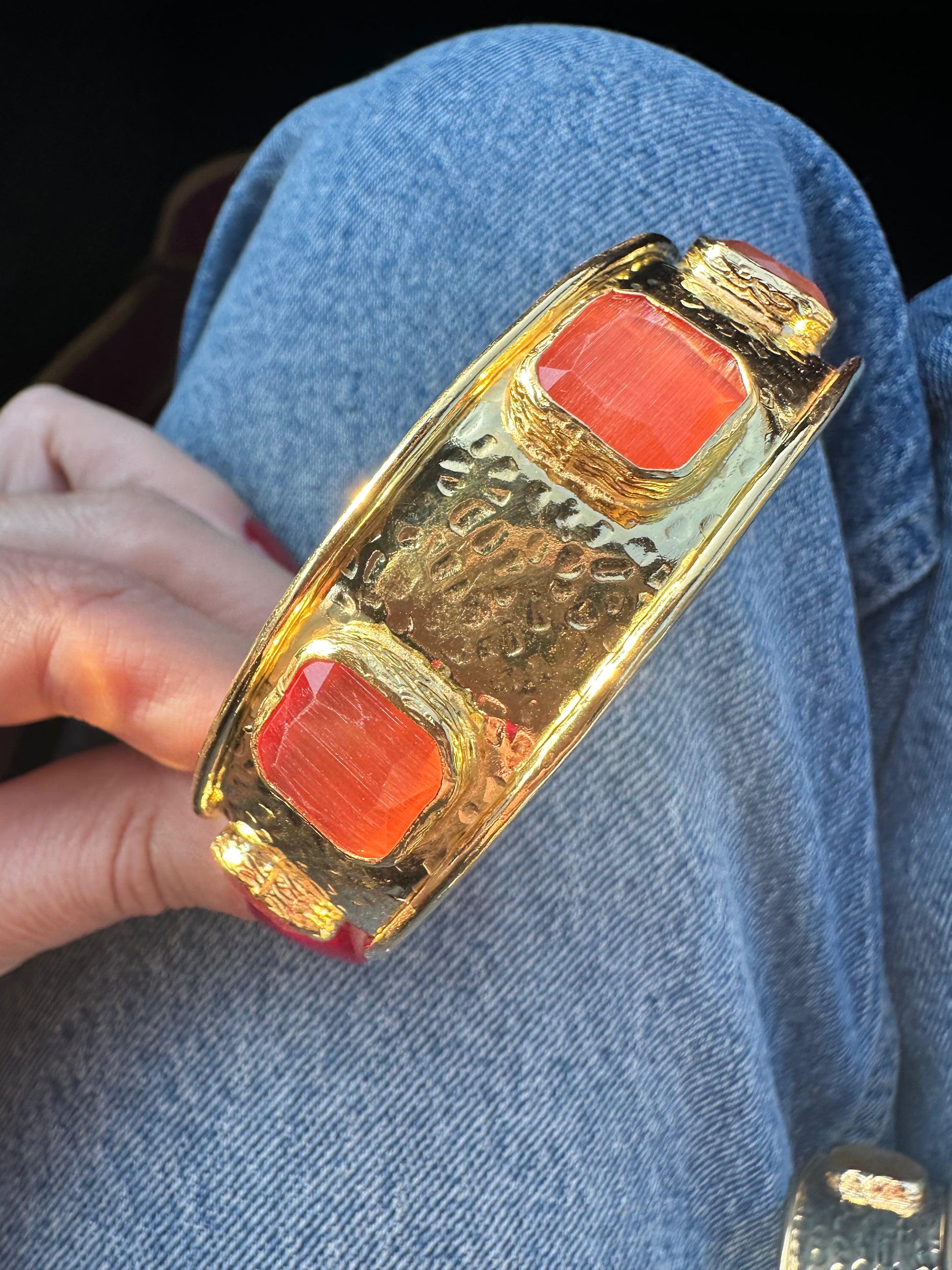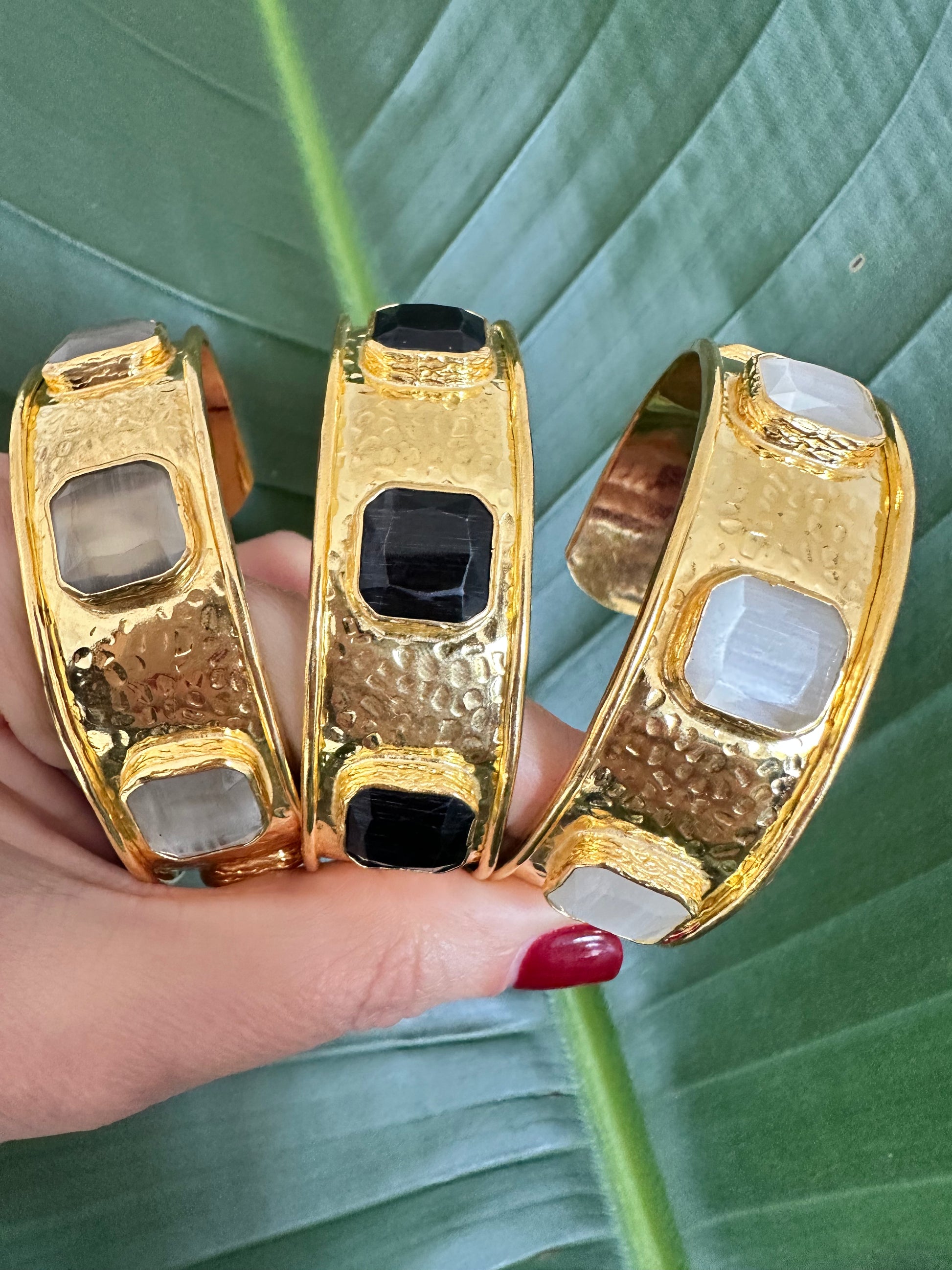 Splendidi bracciali bangle in ottone martellato con pietre incastonate. Disponibile in 10 varianti colore: beige nude, rosa, bianco (il bianco è un bianco sporco), verde smeraldo, blu (celeste) e arancione (simile al colore della corniola), giallo, verde chiaro e blu jeans.