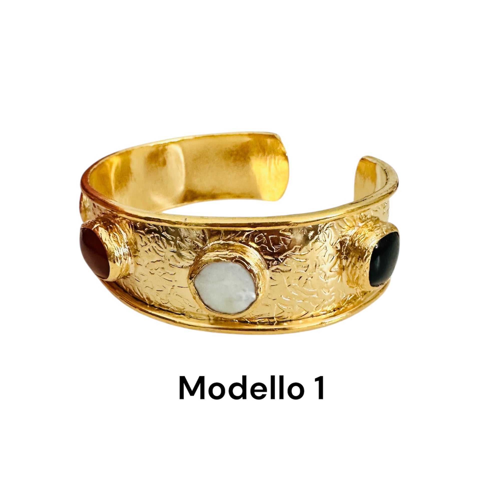 In questa versione del bracciale in ottone placcato oro con finitura lavorata a mano troviamo un mix di pietre dure naturali dai colori caldi e perfetti per i tuoi outfit autunnali.