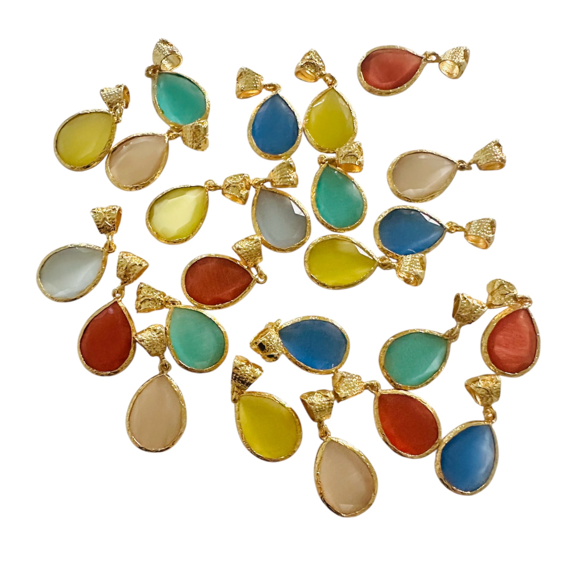 Sfiziosissimi ciondoli in ottone placcato oro giallo con 6 diverse tonalità di pietre a goccia.