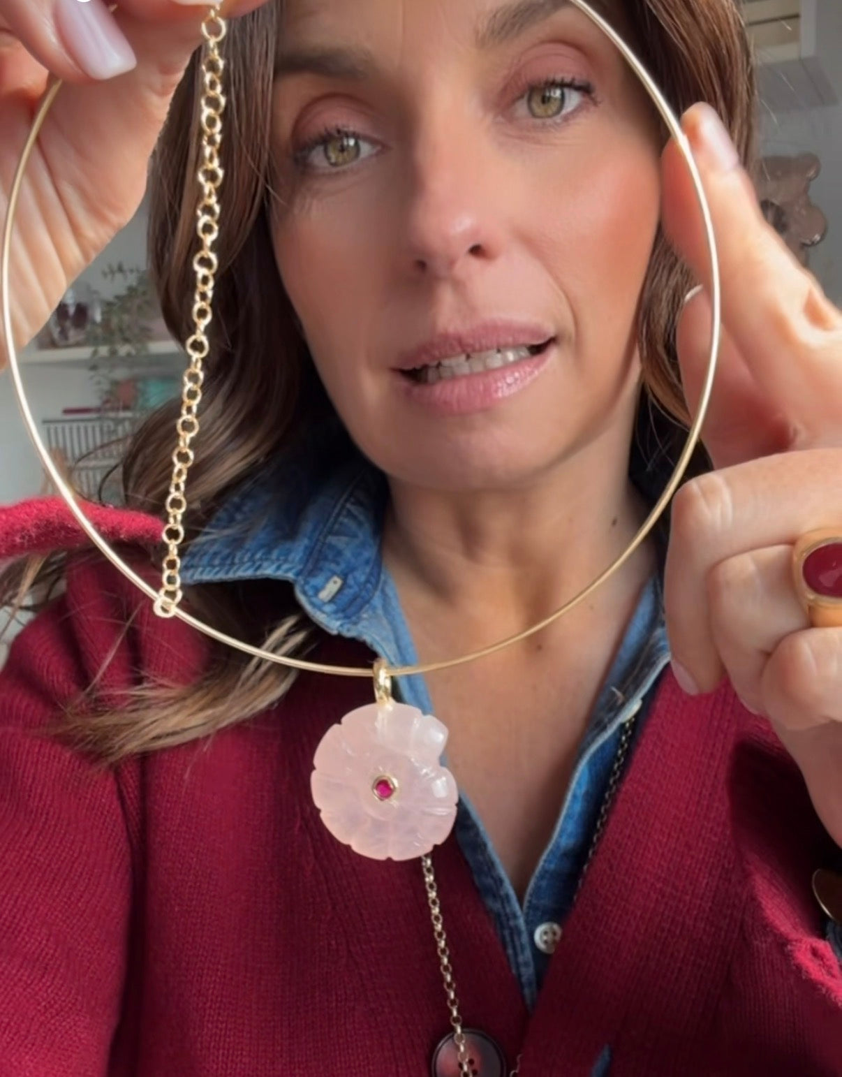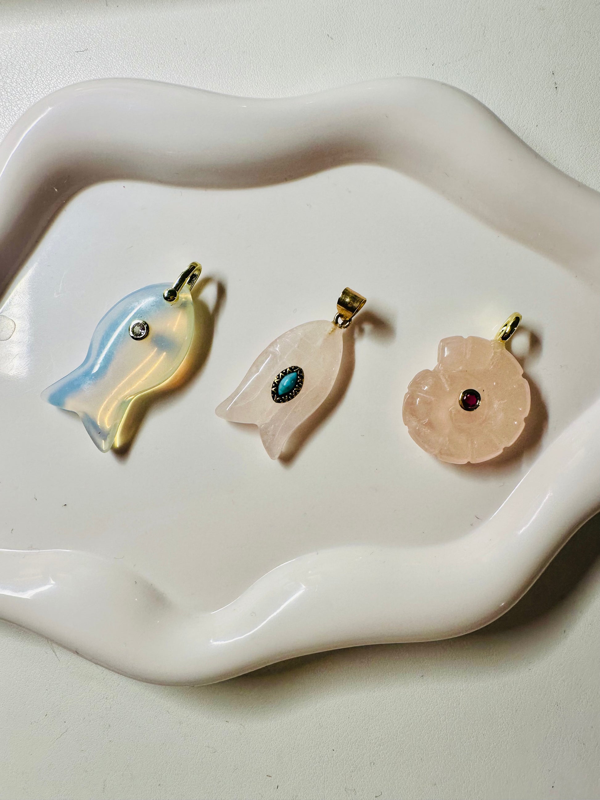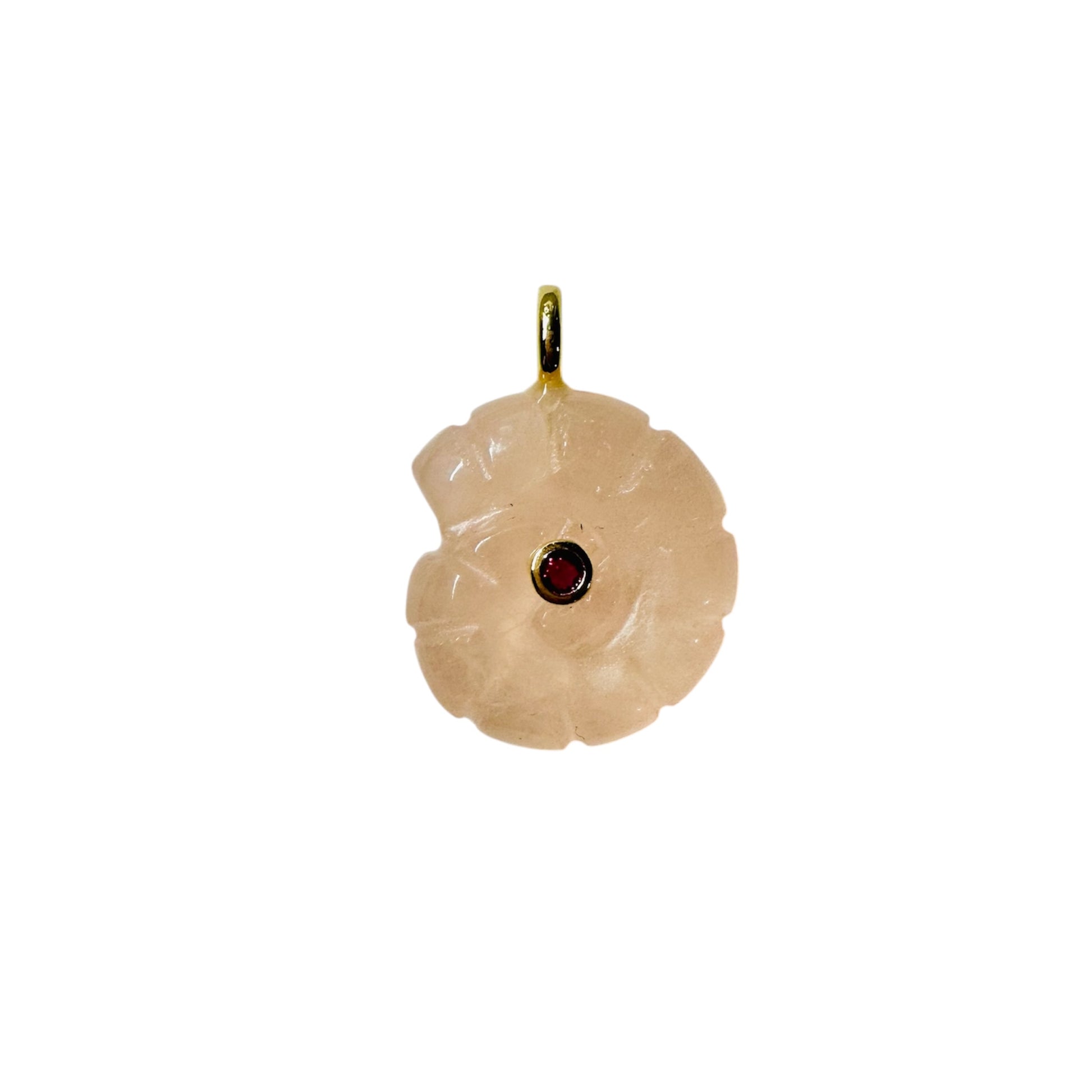 Ciondolo in quarzo rosa naturale stilizzato con forma di un’Ammonite. Simbolo di rinascita e forza.