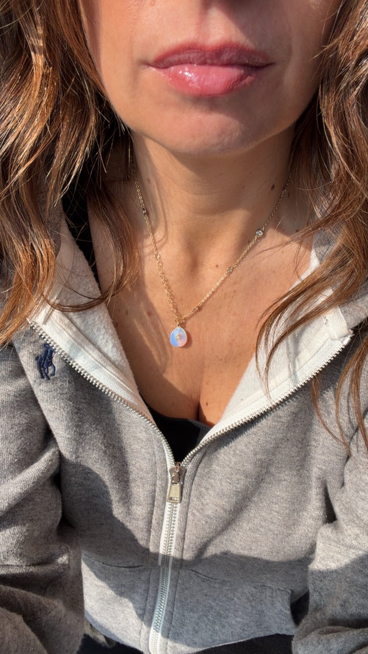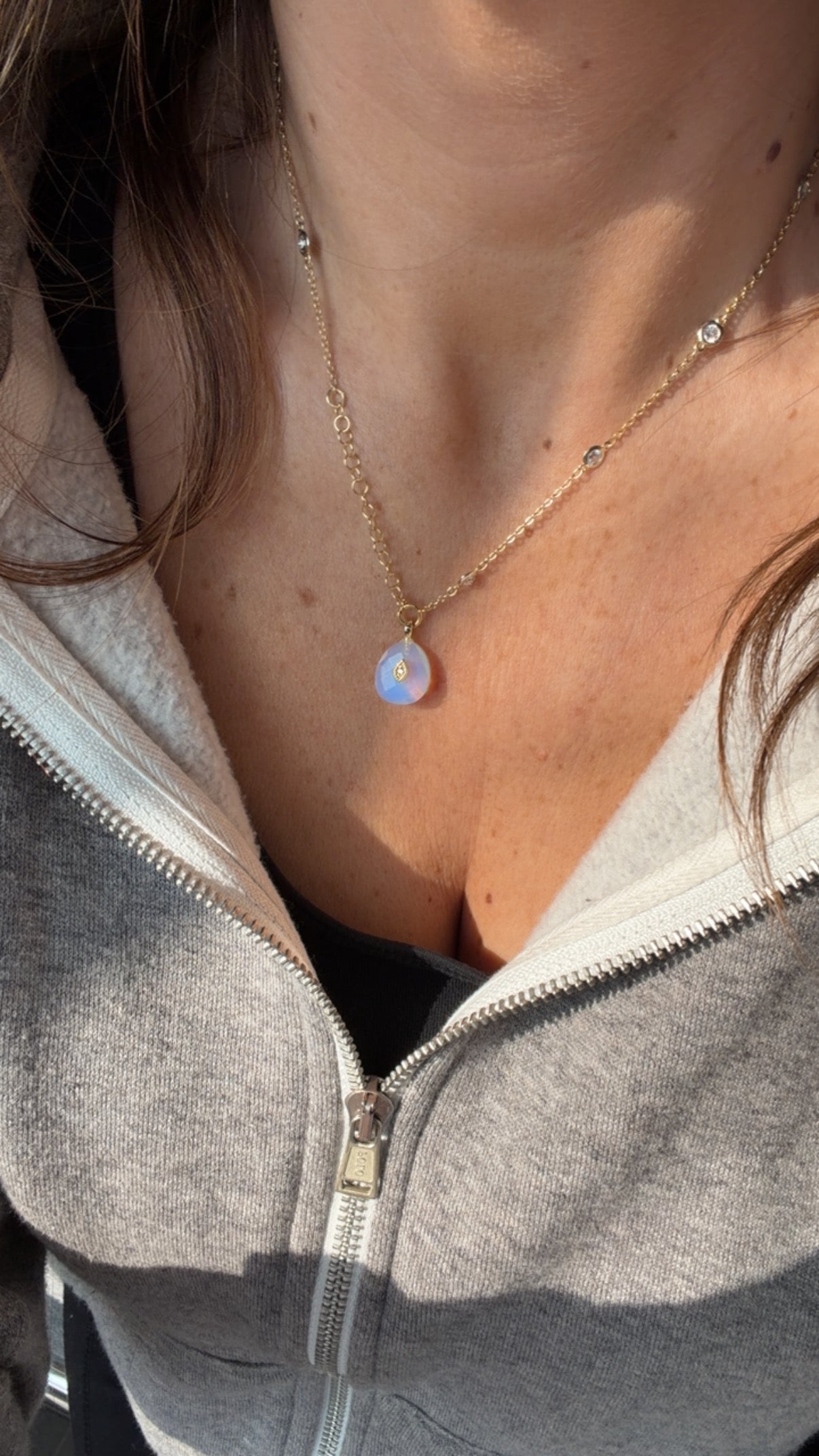 Luce assoluta grazie a questo ciondolino delizioso in pietra di luna, ottone e punto luce centrale.