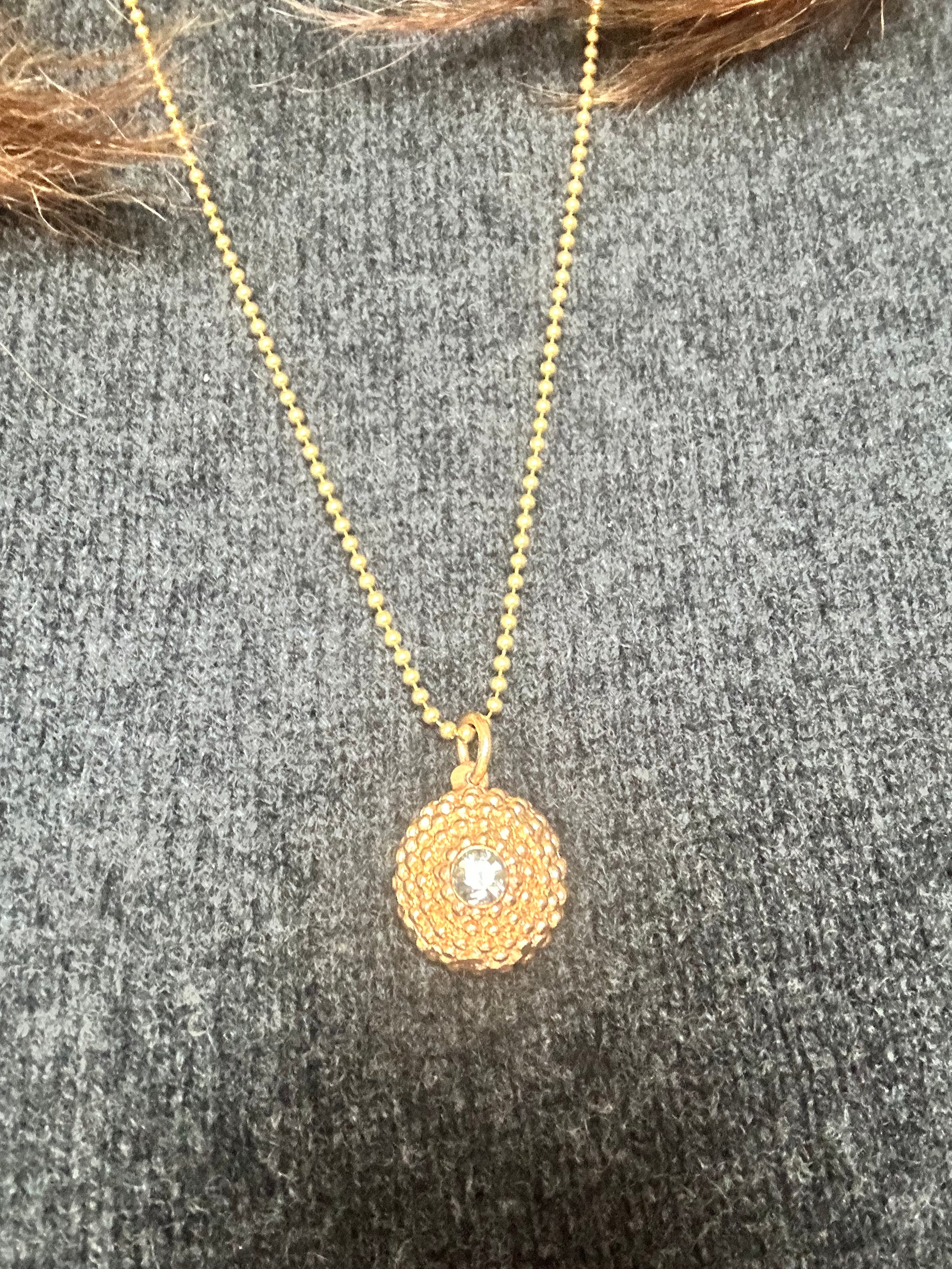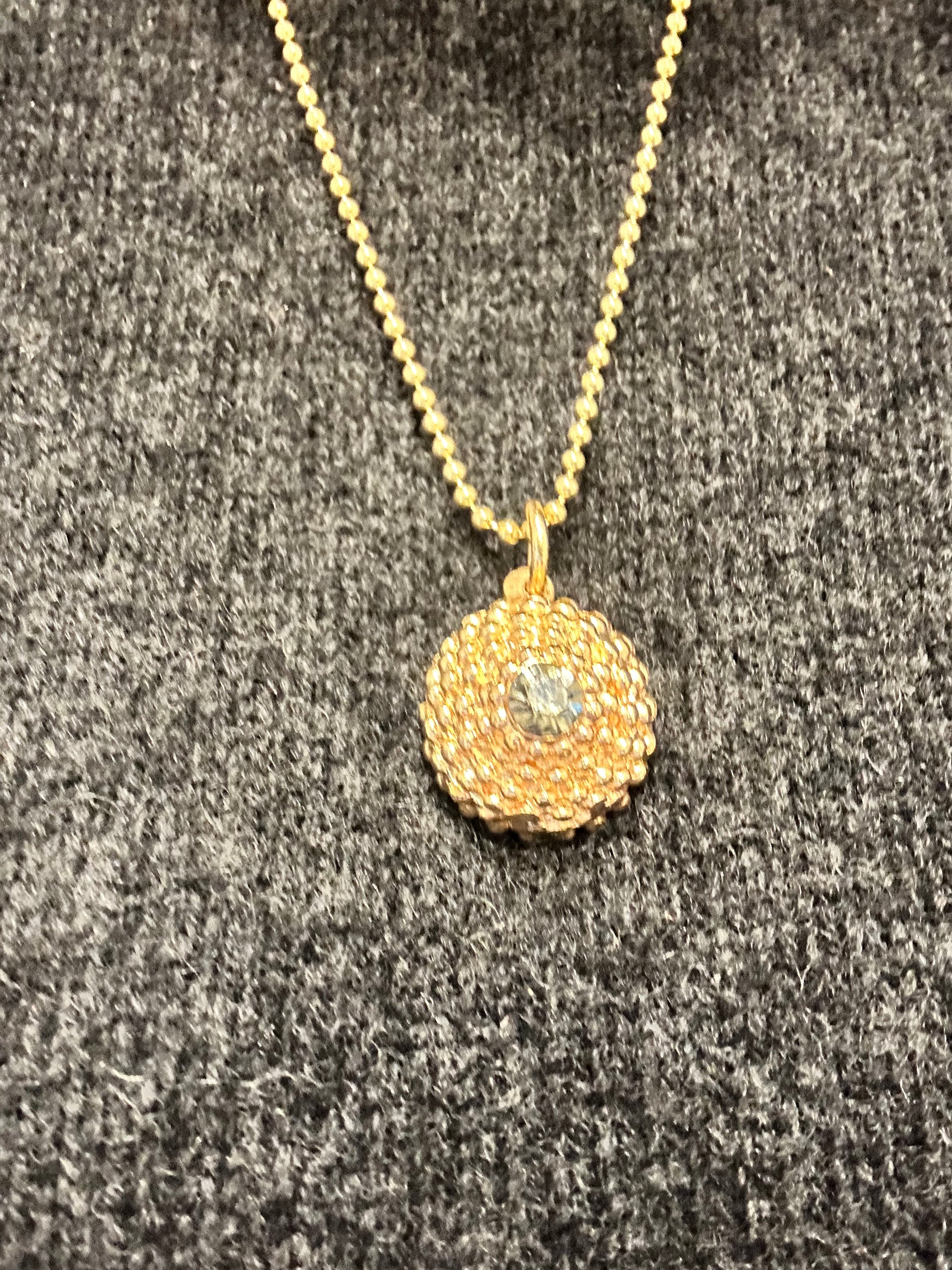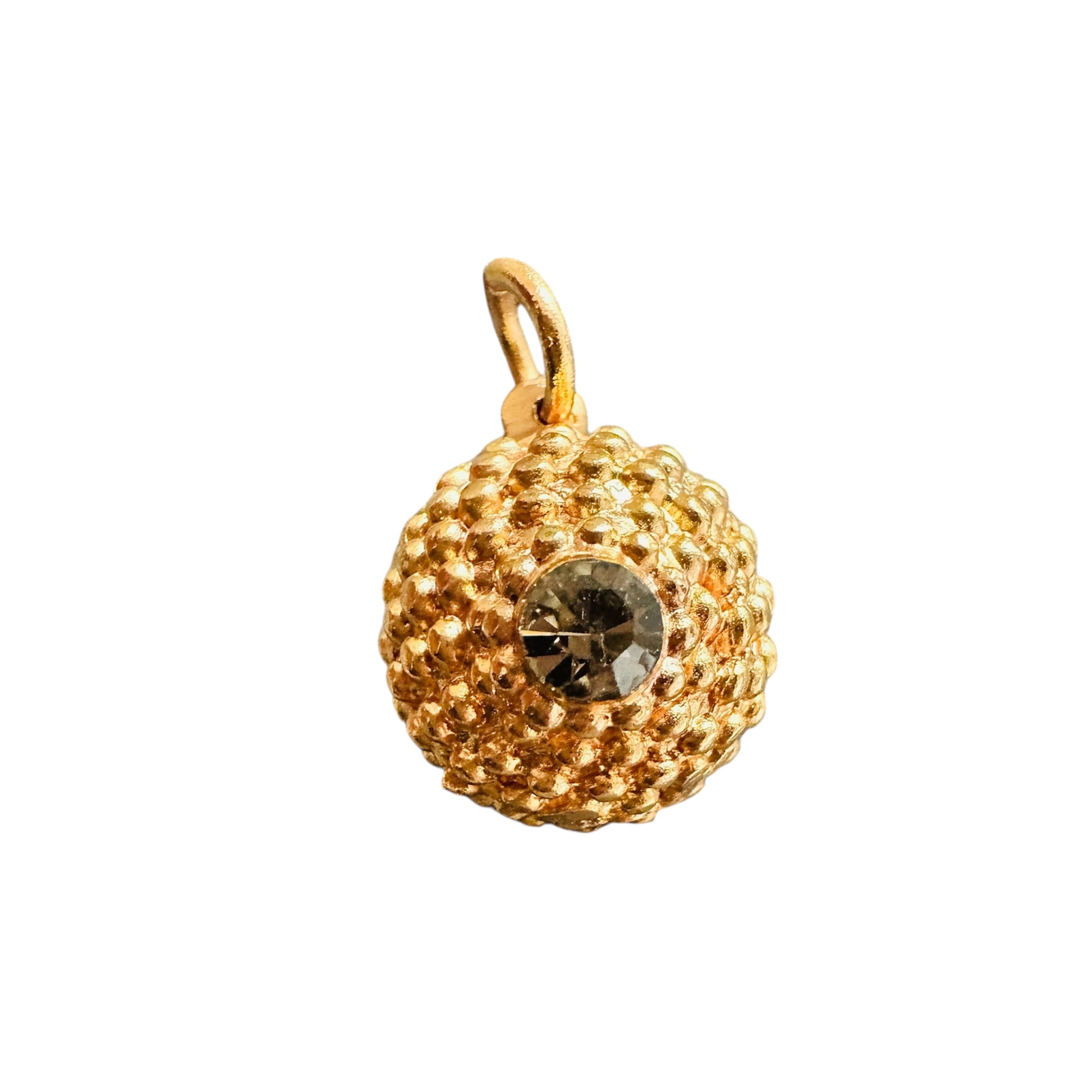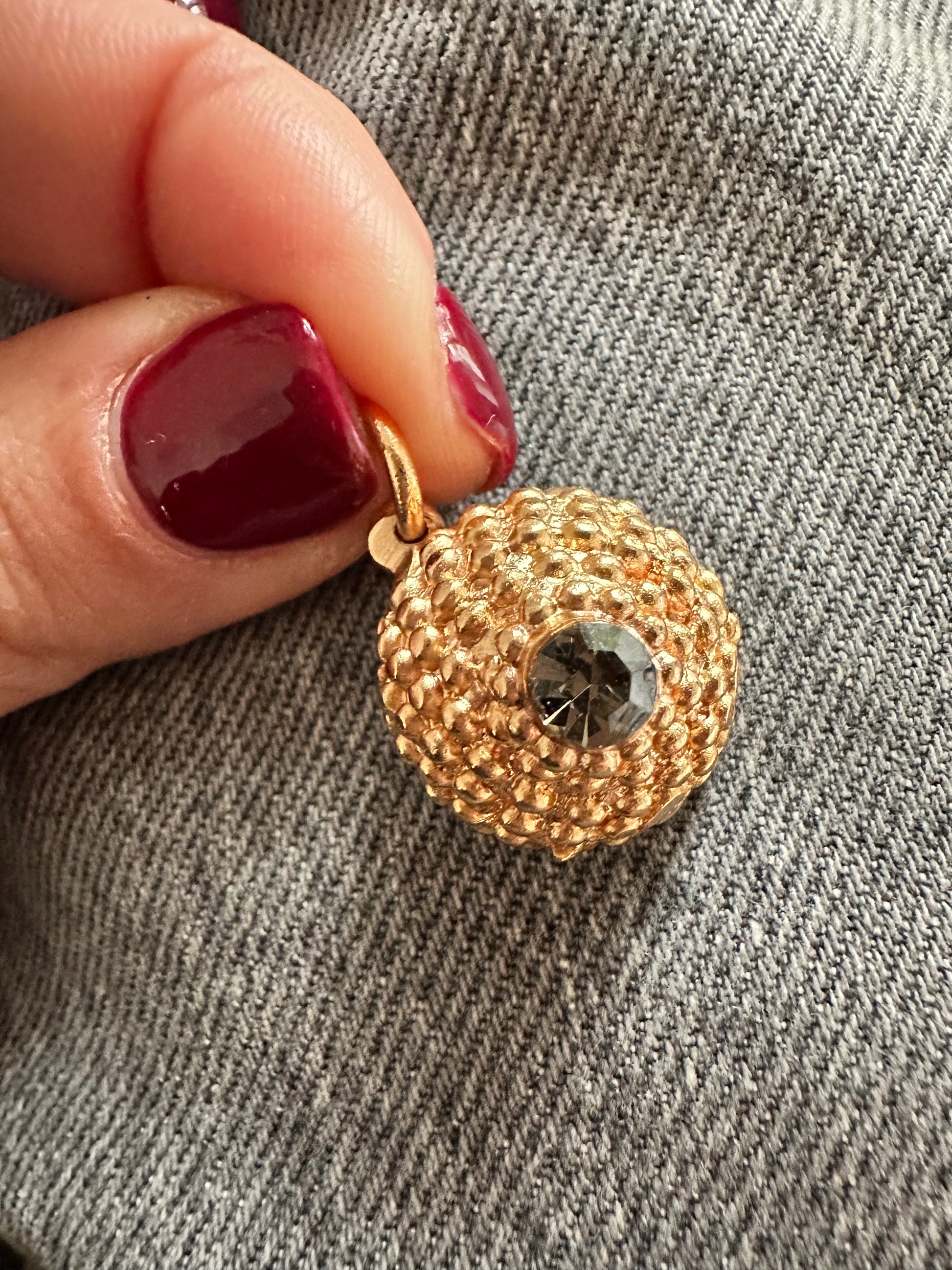 Particolarissimo ciondolo in ottone placcato oro con lega demirouge con zircone fume’.