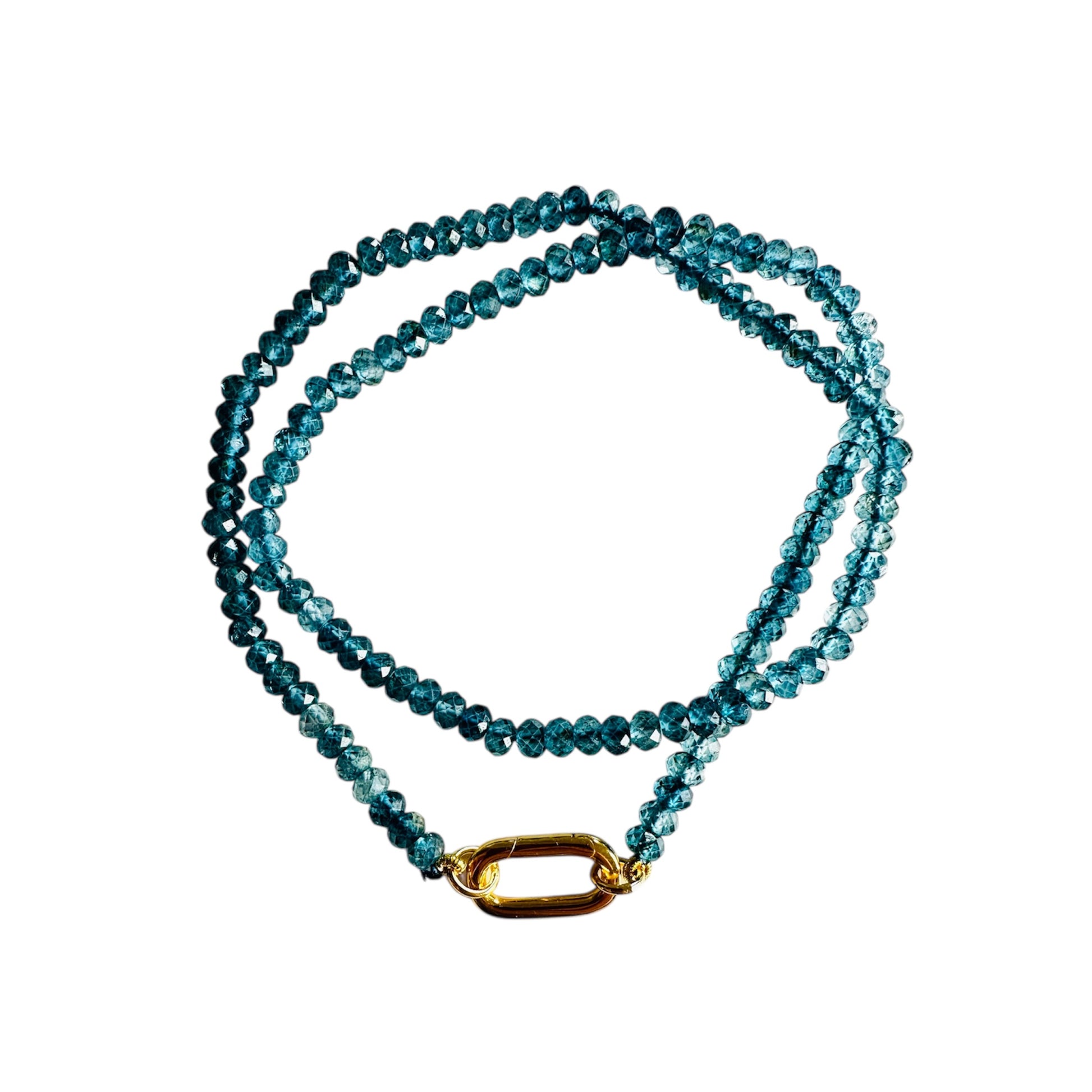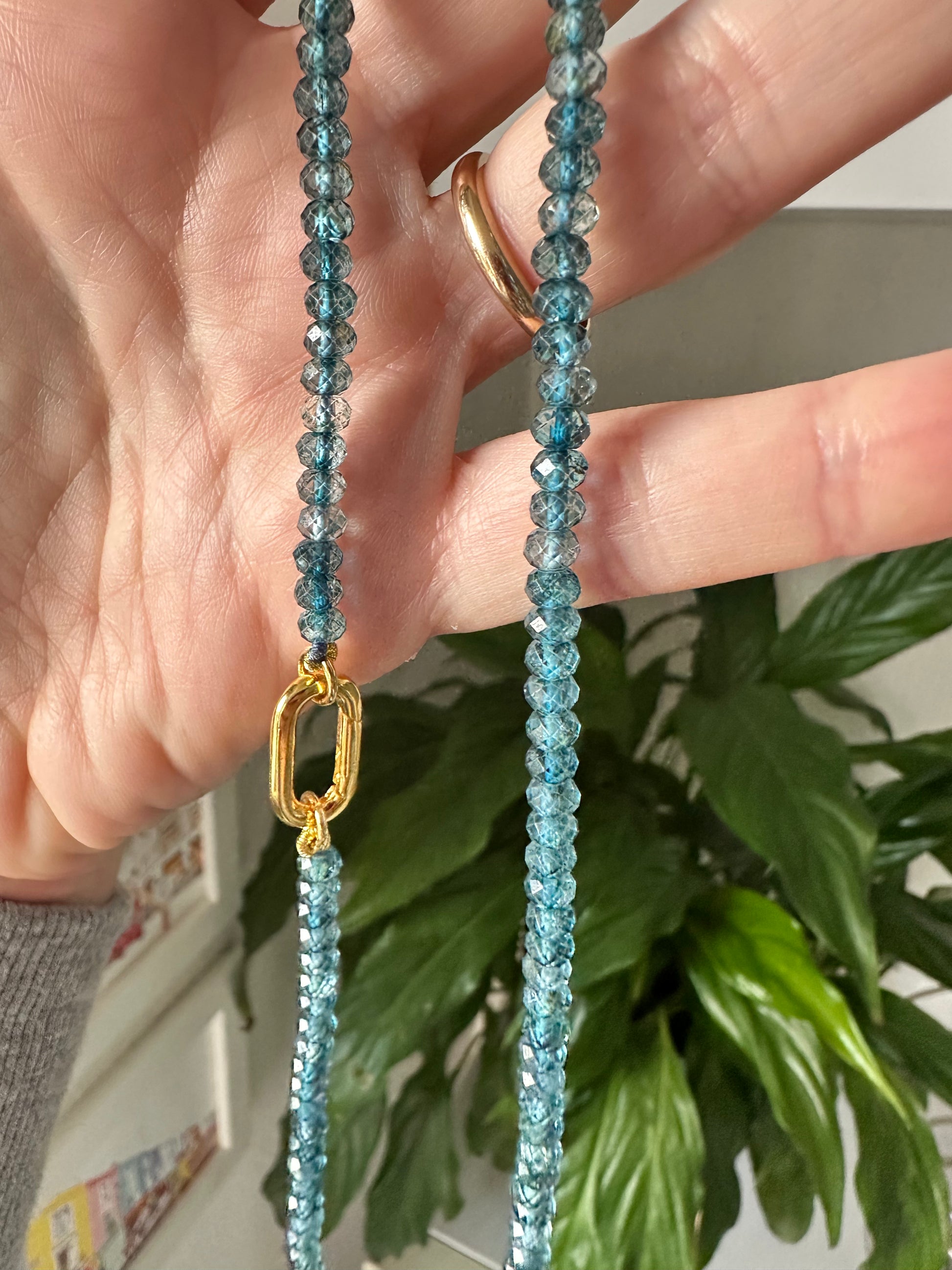 Deliziosa collana girocollo in topazio Blu London ( colore meraviglioso che ricorda il cielo notturno o gli abissi marini) con chiusura in argento 925 placcato oro giallo.
