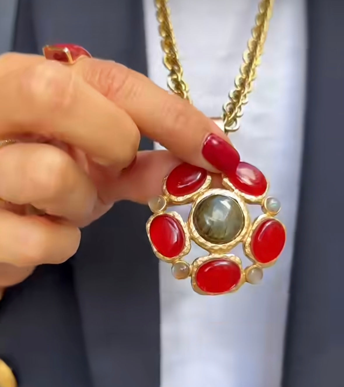 Collana in ottone placcato oro 24k caratterizzata da una splendida catena e da un ciondolo di ispirazione vintage con labradorite e granati.