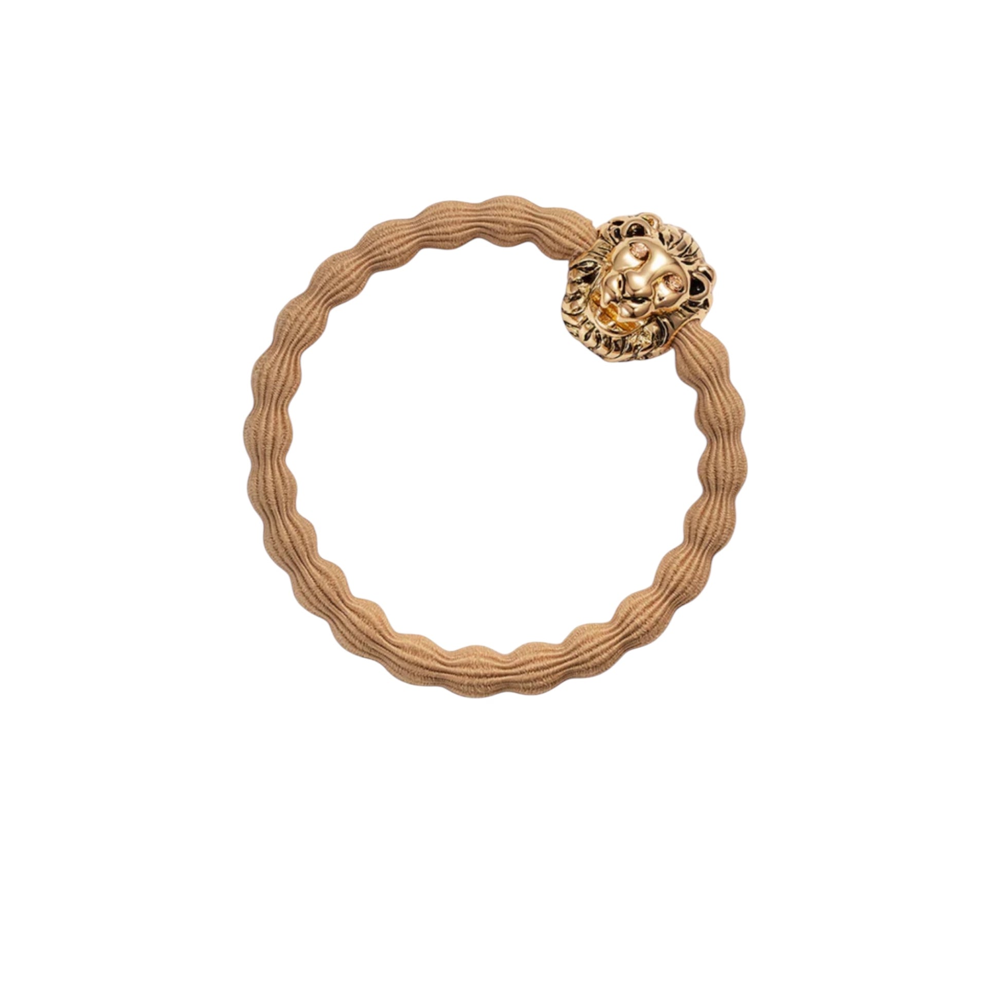 Fantastico ciondolo leone con occhi di strass su elastico color cammello.