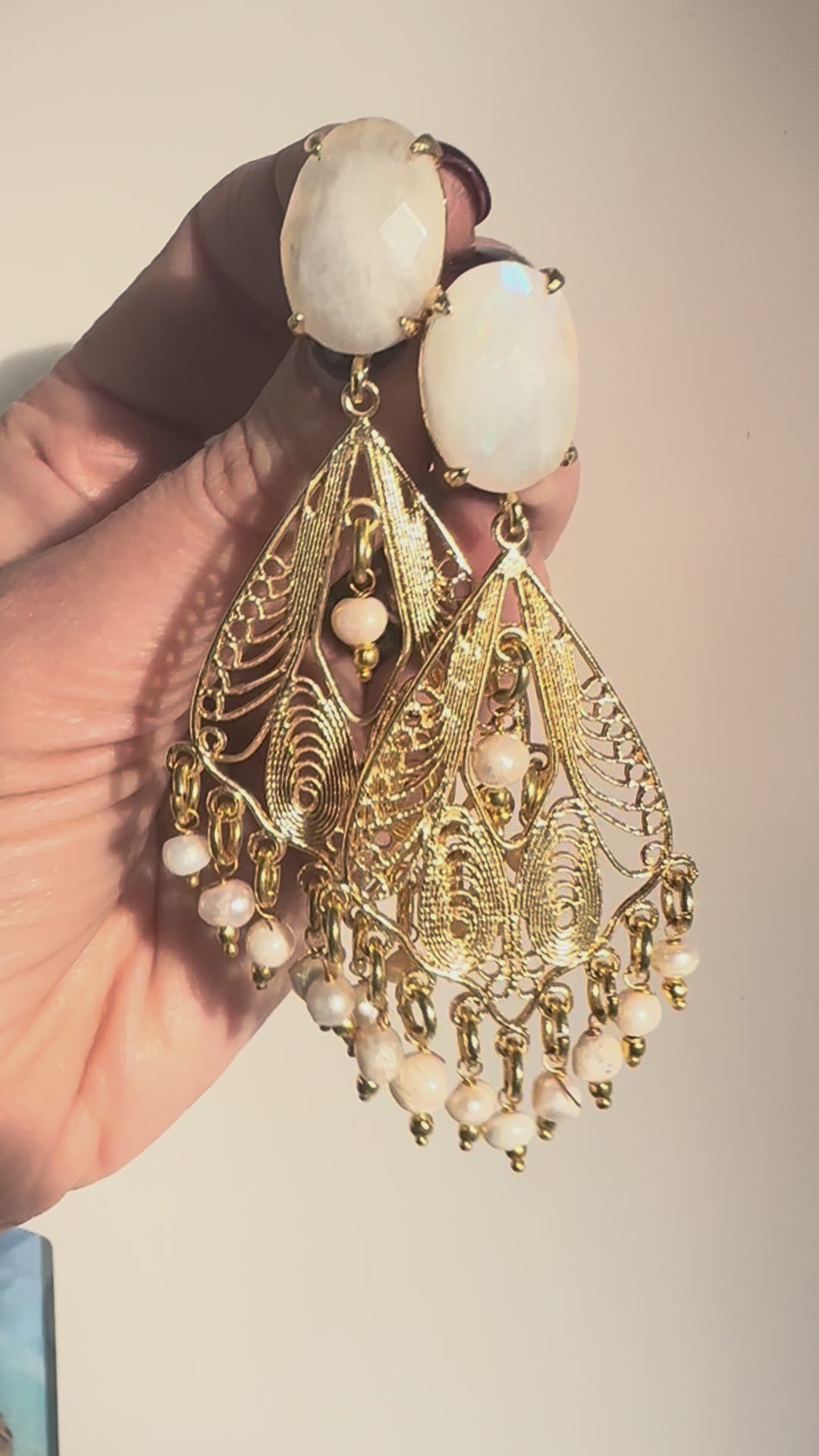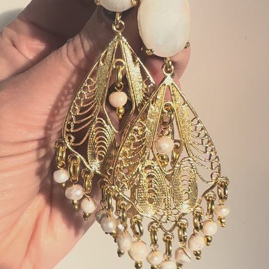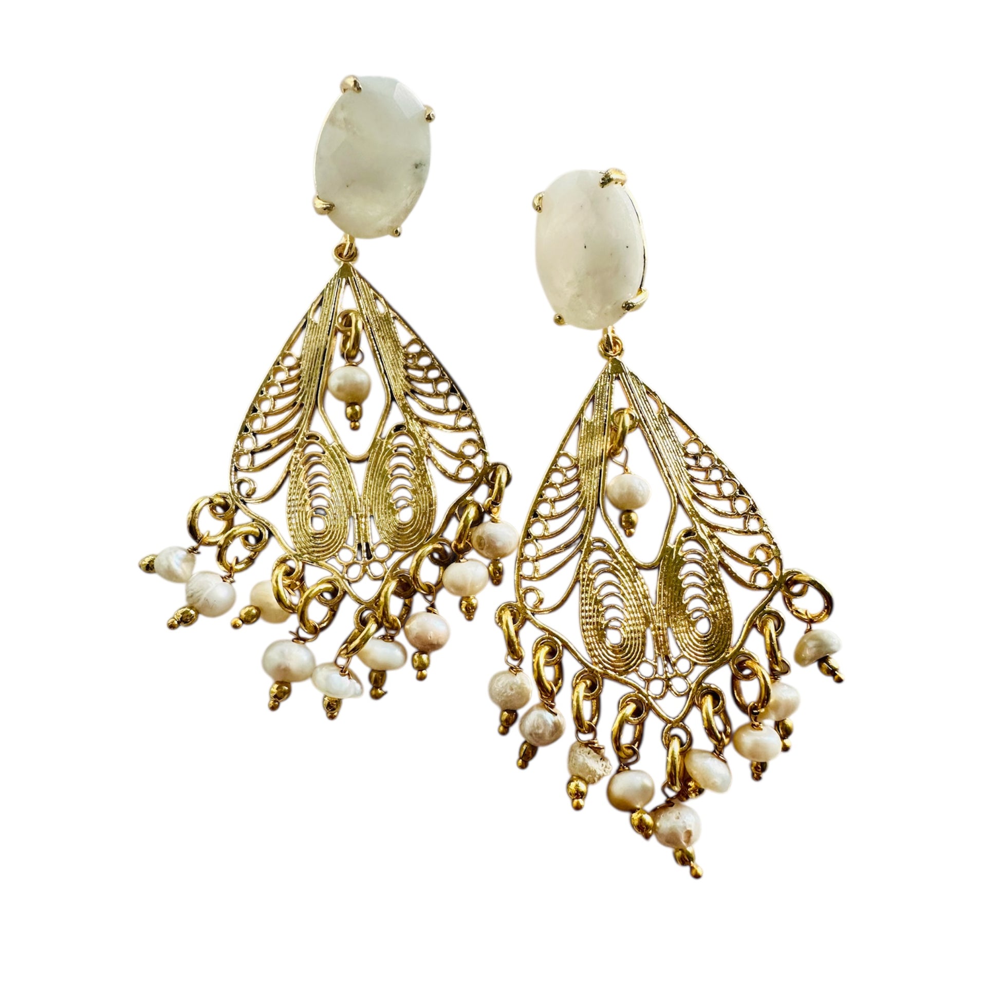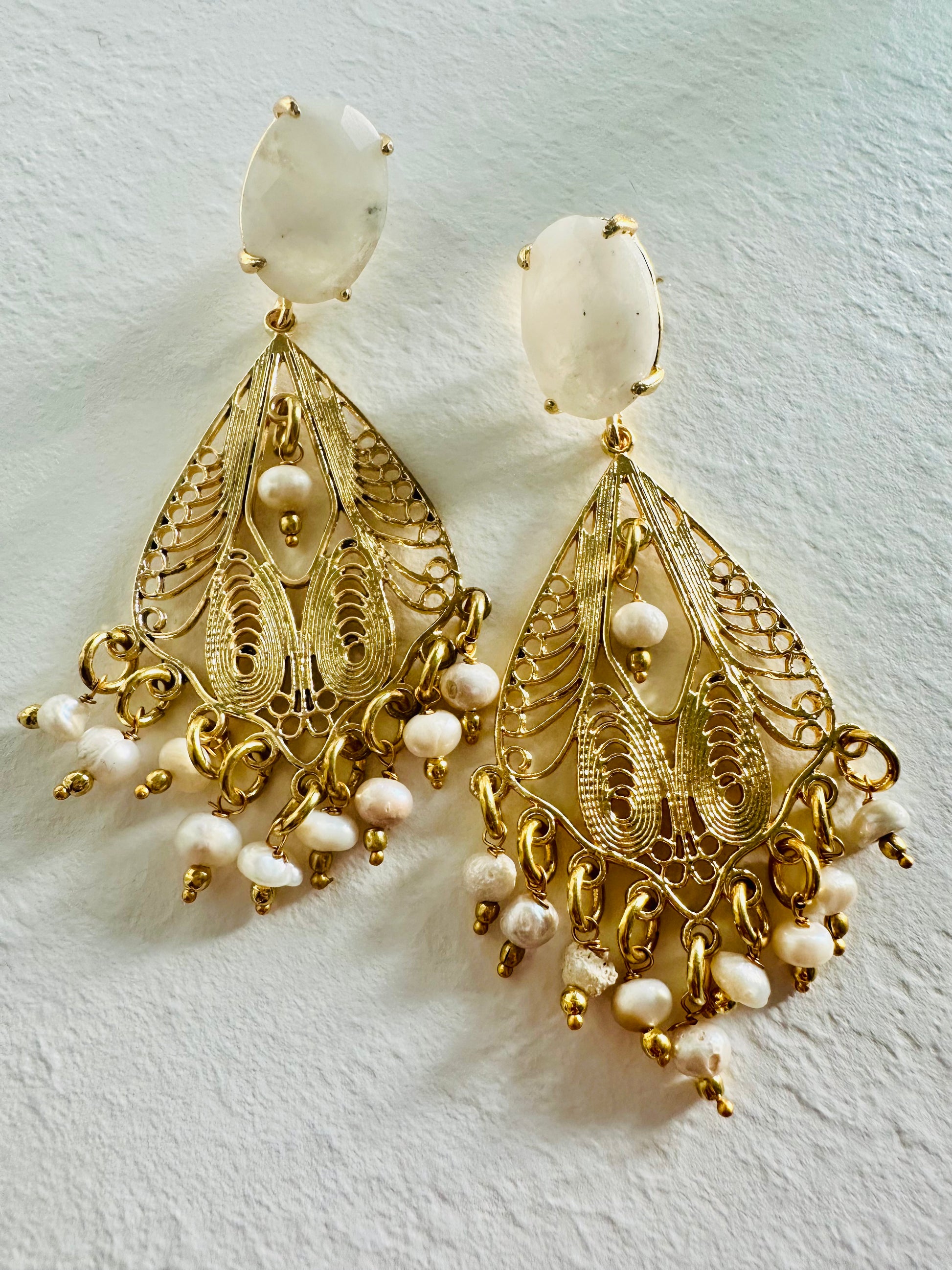 Deliziosi pendenti in filigrana ottone placcato oro con pietra di luna bianca e perline di fiume.