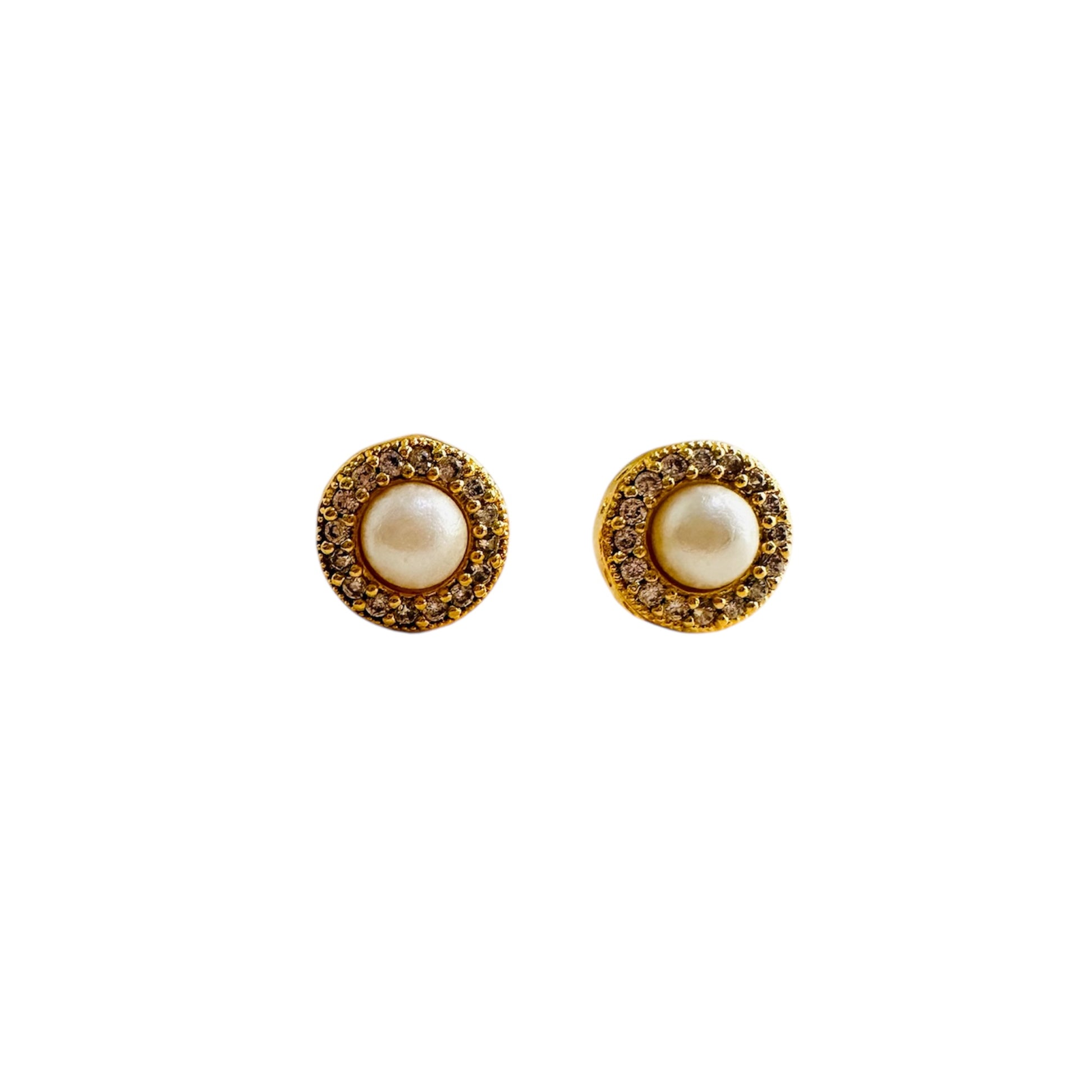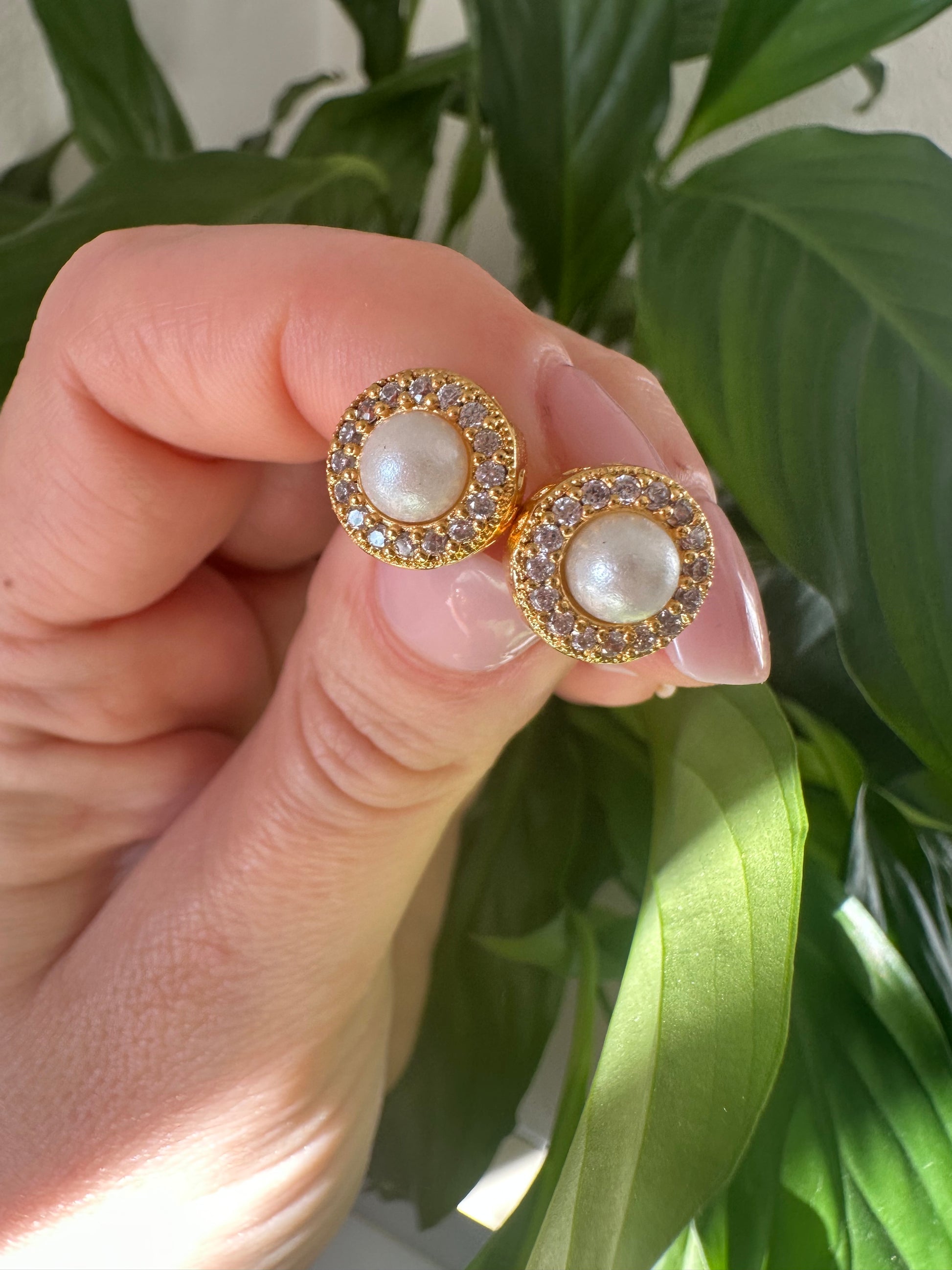 Elegantissimi orecchini a lobo in ottone placcato oro, perline di Maiorca e zirconi.