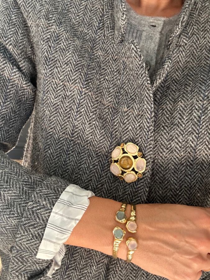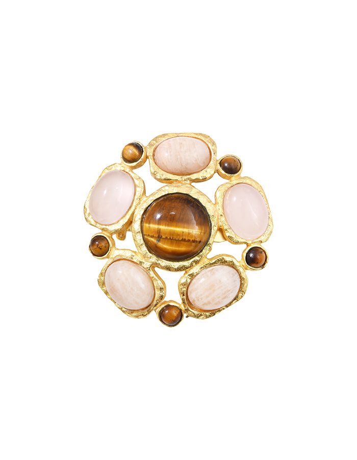 Pavè di pietre dure (quarzo rosa ed occhio di tigre) montate su ottone placcato oro 24k.